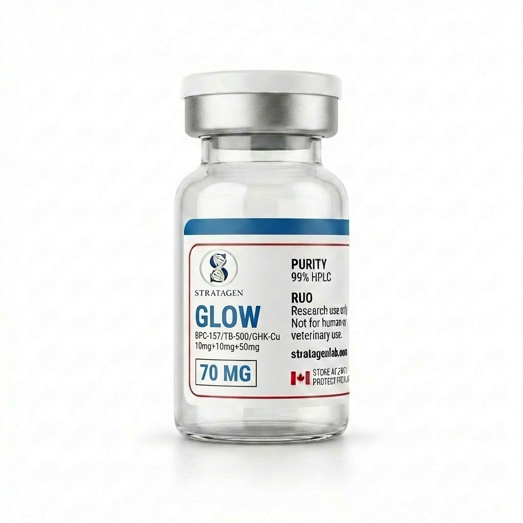 Glow 70mg is a multi-peptide research blend combining BPC-157 (10mg), TB-500 (10mg), and GHK-Cu (50mg) in a single lyophilized vial. This formulation is designed for advanced laboratory studies examining tissue signaling, cellular repair pathways, and extracellular matrix regulation.